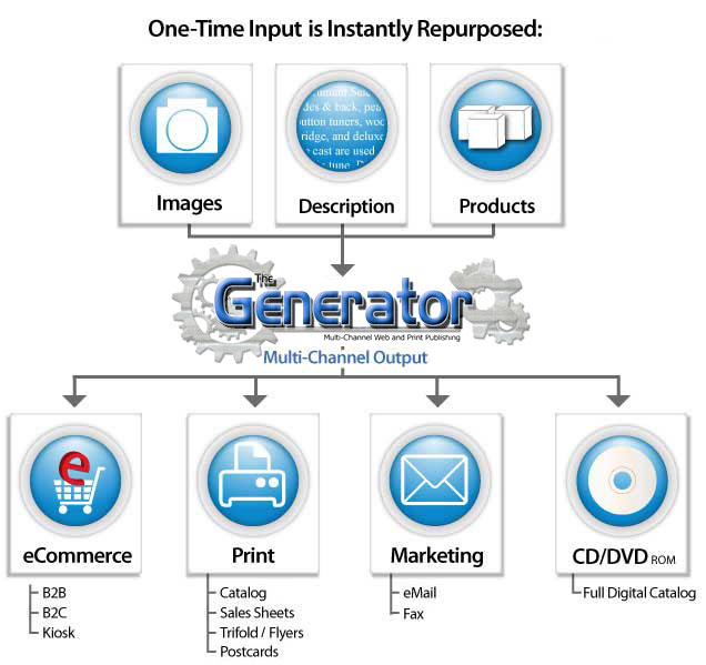 The Generator is a totally integrated system that features one-time data entry of product info repurposed through powerful web-based sales and marketing software.